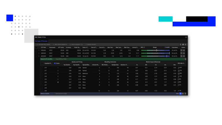 - Pre- and Post-trade Execution Cost Analytics: Available from FXall as well as specialist partners, including Tradefeedr. Access unique analytics to optimise your execution outcomes and benchmark the quality of liquidity you receive.