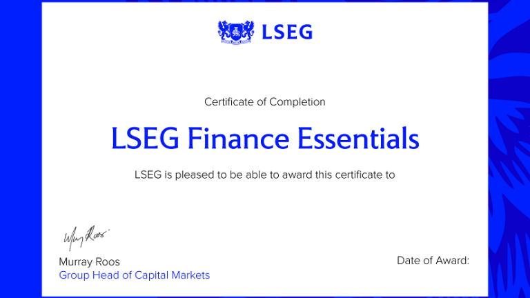 Receive a globally recognized certificate that demonstrates your knowledge signed by LSEG’s Group Head of Capital Markets. Upon successful completion of a final assessment you will be issued a certificate that you can easily share with peers and future employers on LinkedIn.